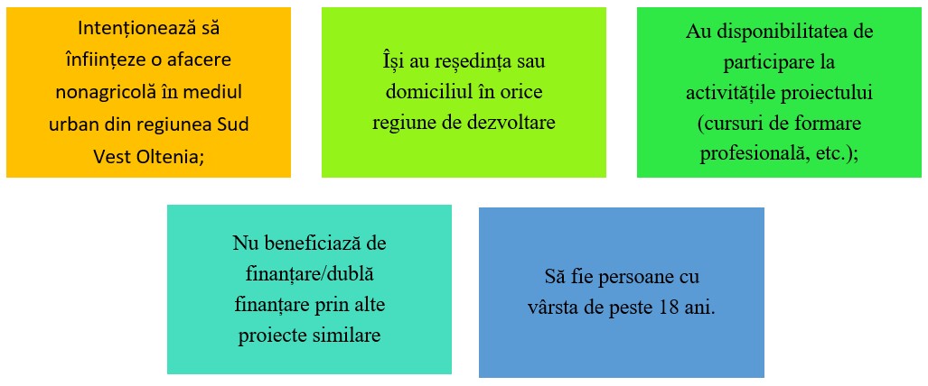 Obiectivul general al proiectului este acela de susținere a dezvoltării economice și sociale în Regiunea Sud-Vest Oltenia prin sprijinirea, încurajarea și dezvoltarea antreprenoriatului în rândul tinerilor – înființarea, monitorizarea și asigurarea sustenabilității a minim 21 start-up-uri în cadrul cărora se vor crea minim 66 locuri de muncă sustenabile